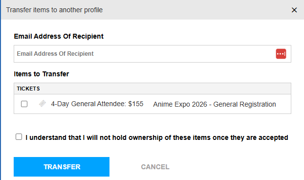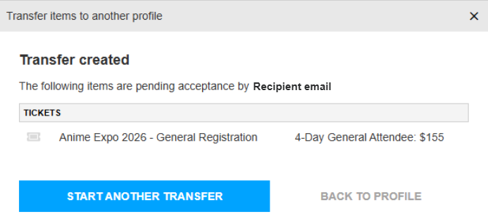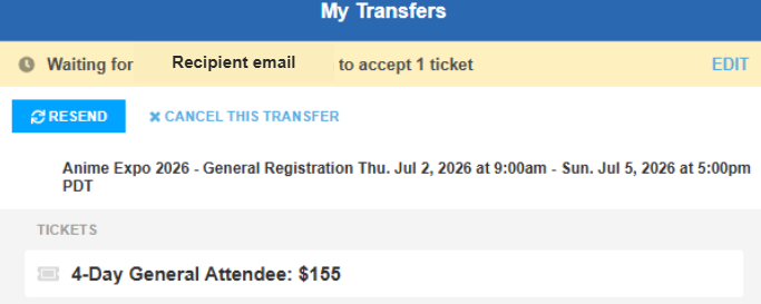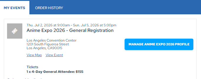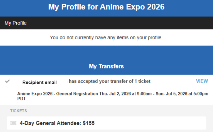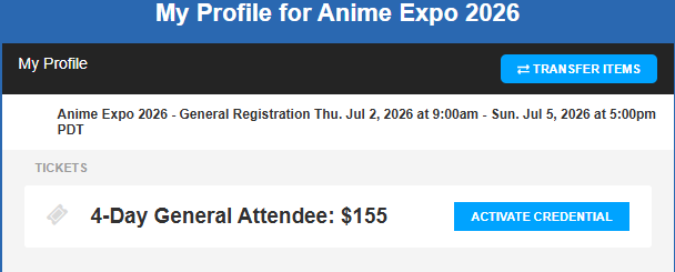 Note: If you are transferring general attendee badges, the event name will be Anime Expo 2026 – General Registration